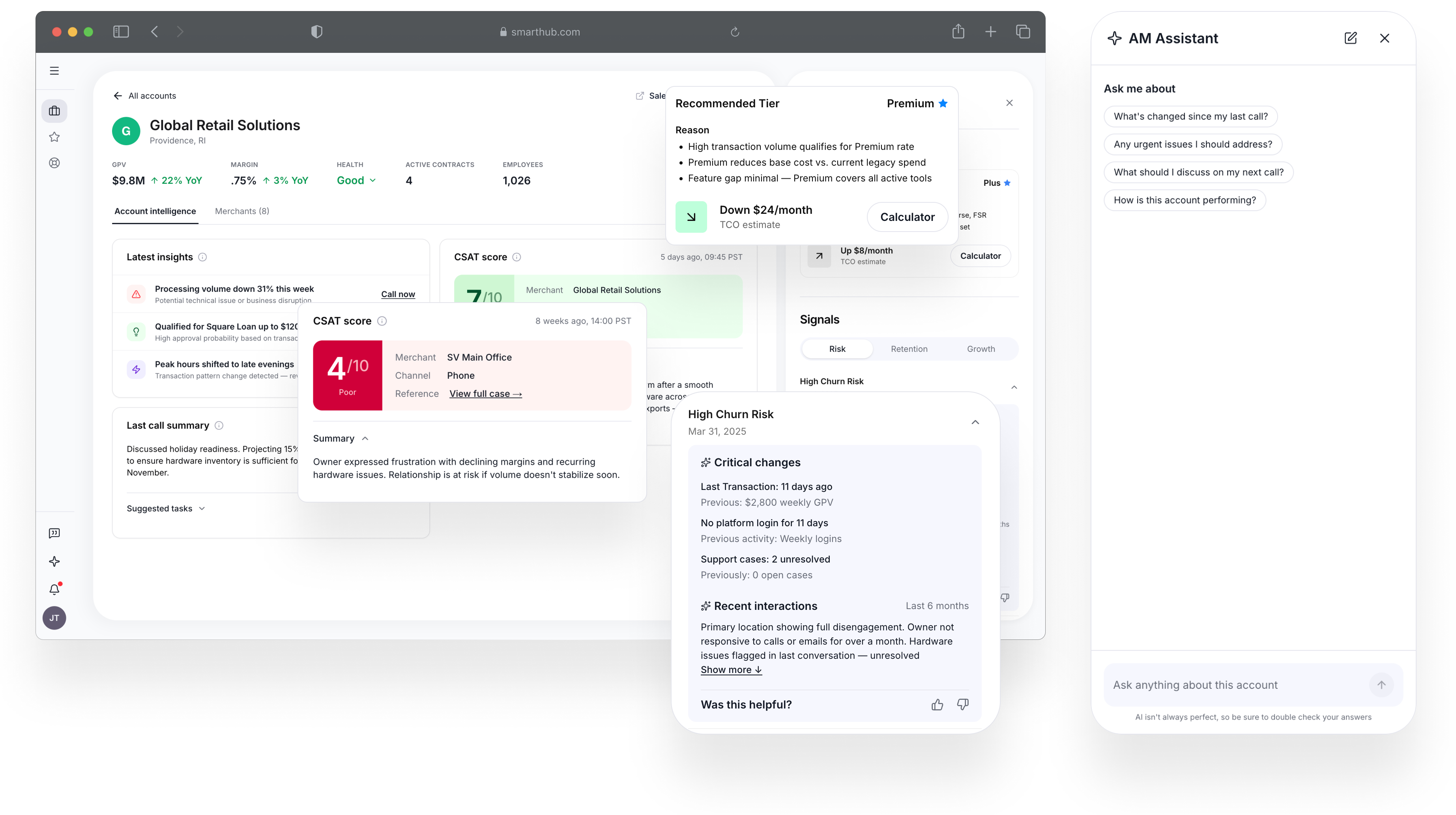 Square’s highest-value Account Managers were running million-dollar seller relationships out of Google Sheets. Every morning meant opening multiple tools, cross-referencing data that didn’t always match, and piecing together a picture of accounts worth millions. There was no signal telling them who needed attention, no way to see problems coming, and no visibility into how their book was performing against the new variable pay structure that determined their own compensation.